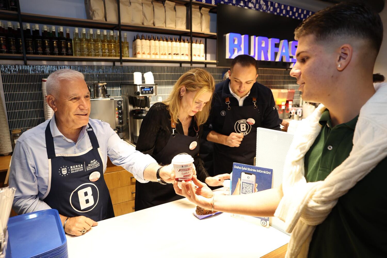 Eşi Seden Bozbey ile birlikte barista önlüklerini giyen Başkan Bozbey, Cumhuriyetin 102. yılına özel olarak hazırlanan ‘Cumhuriyet Demek’ temalı bardaklarda içecek ikramında bulundu. Vatandaşların isimlerini ‘Cumhuriyet demek’ temalı bardaklara yazan Başkan Mustafa Bozbey ve eşi Seden Bozbey, Atatürk’ün emanet ettiği Cumhuriyet’in sıcaklığını Bursalılarla birlikte paylaştı. Bu sene kutlamaların teması olan ‘Cumhuriyet demek, hepimiz demek’ sloganını da yazarak ikramda bulunan Başkan Bozbey ve eşi Seden Bozbey, kahve keyfini vatandaşlarla birlikte yaşadı.