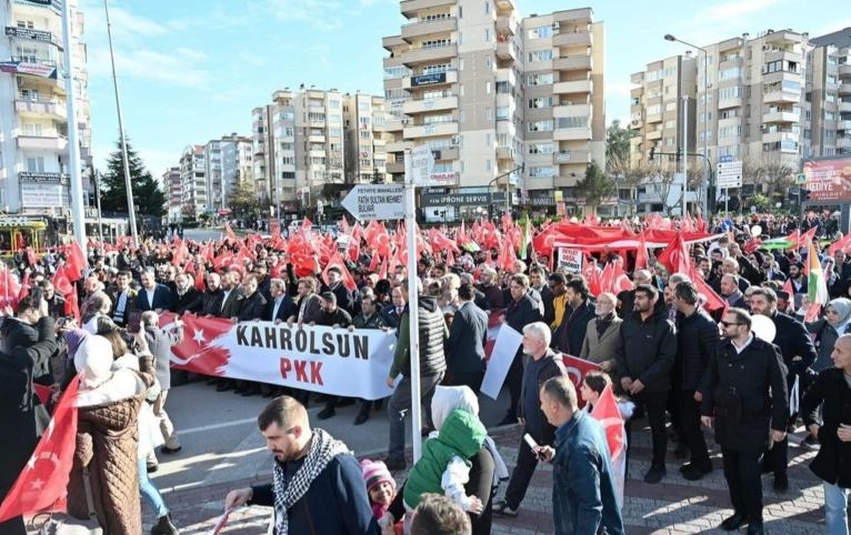 Bursa’da binlerce kişi, teröre lanet ve Filistin’e destek için Fatih Sultan Mehmet Bulvarı’nda buluştu.