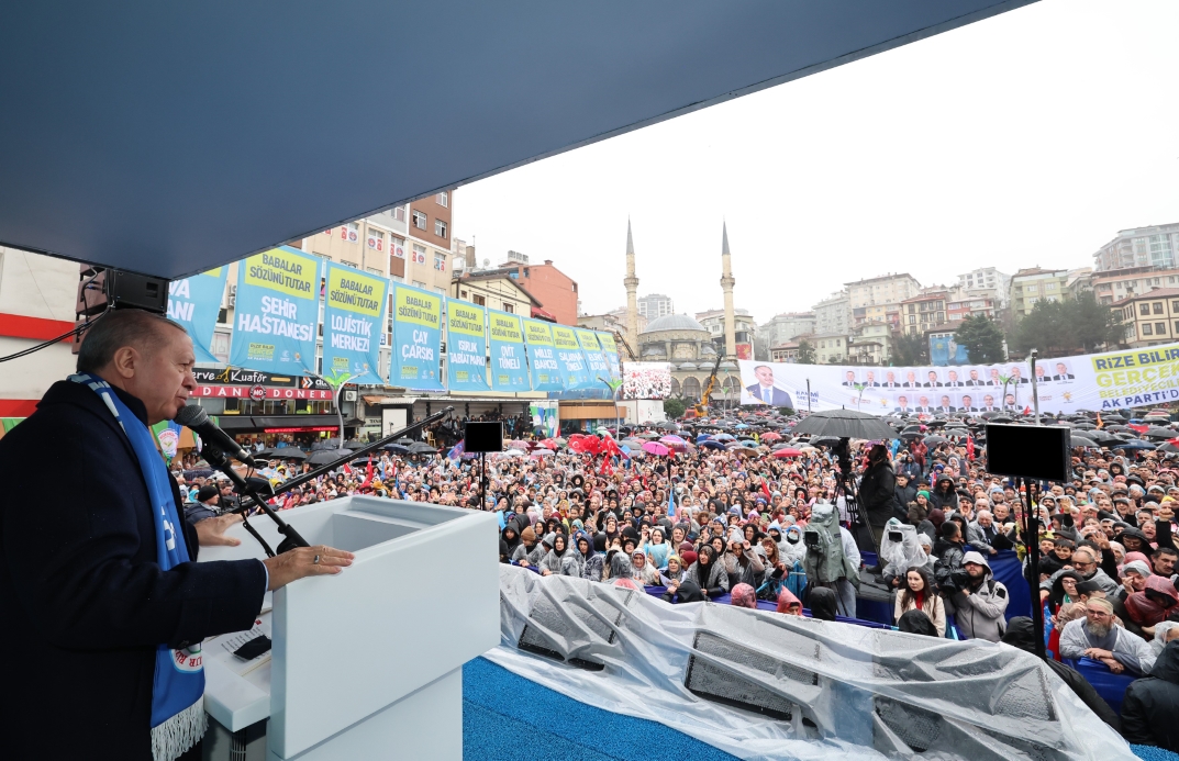 Cumhurbaşkanı Recep Tayyip Erdoğan, Rize’den tüm Türkiye’deki seçmenlere seslenerek “Muhalefete bakıp da asla yeise kapılmayın. Asla alternatifsiz değilsiniz. CHP’nin iş bilmez, beceriksiz, kendini düşünen idarecilerine mecbur ve mahkum değilsiniz. Şayet siyasetten beklentiniz hizmet ve eser görmekse hiç uzağa gitmenize gerek yok. AK Parti ve Cumhur İttifakı olarak işte biz buradayız. Kendi iktidarları uğruna size dayatmalarda bulunanlara sizin kaygılarınızı istismar edenlere size ‘Bizim istediğimiz adaya tıpış tıpış oy vereceksiniz’ diyenlere; kim diyordu bunu biliyorsunuz değil mi ? Belediye başkanı olarak kimi görmek istersiniz sorusunu bile millete değil de yapay zekaya soranlara, sizin fikrinize, taleplerinize, hassasiyetlerinize saygı göstermeyenlere kendi şahsi ikballeri için kapalı kapılar ardında bölücü örgütün uzantıları ile ‘Dem’lenenlere, anladınız değil mi ? Bizim çayın demlenmesi değil ha DEM diye bir parti var ya, onlarla demlenenler var. Hasılı size rağmen siyaset yapanlara bu seçimde esaslı bir ders vermeye hazır mıyız ? Hür iradenizin hiç kimsenin tapulu mülkü olmadığını gelin bu kibir abidelerine gösterin. 31 Mart’ta tüm Türkiye’de biz çok farklı bir tablo bekliyoruz. Bu seçimlerin ülkemizde özellikle muhalefette gerçek manada bir değişim dalgasını ortaya çıkartacağını inanıyoruz” ifadelerini kullandı.