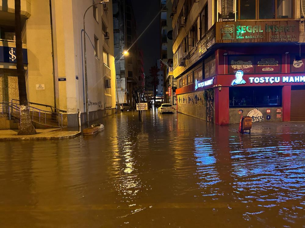 Hatay’ın İskenderun ilçesinde akşam saatlerinde etkili olan yağışla birlikte caddeler göle döndü.