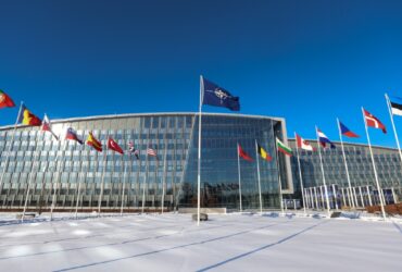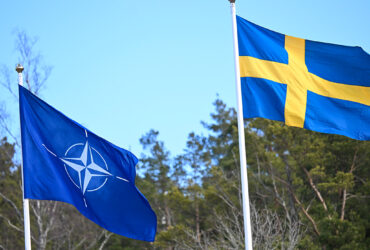 NATO'nun 32'nci üyesi olan İsveç'in bayrağı, Belçika’nın başkenti Brüksel'deki NATO karargahında ...