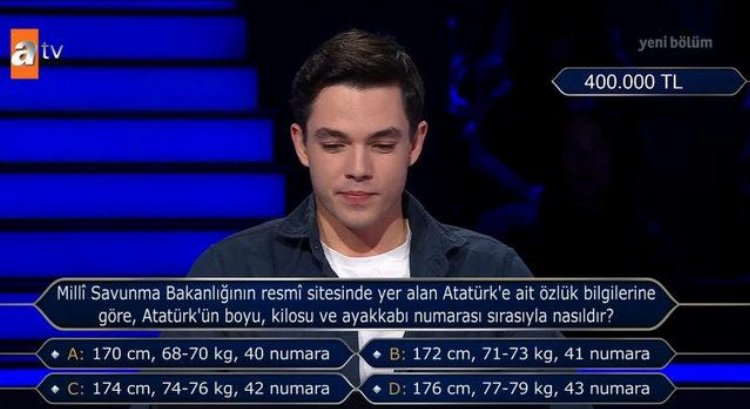 400 bin TL değerindeki 11. soruda Batuhan Alıcı’ya “Milli Savunma Bakanlığı’nın resmi sitesinde yer alan Atatürk’e ait özlük bilgilerine göre, Atatürk’ün boyu, kilosu ve ayakkabı numarası sırasıyla nasıldı?” sorusu soruldu.
