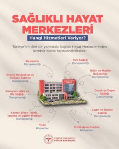 Bu merkezlerin toplumun yaşam kalitesini yükseltecek alışkanlıkları kazandırmayı amaçladığını ifade eden Çetin, “Sağlıklı hayat merkezlerinde; diyetisyen rehberliğinde sağlıklı beslenme danışmanlığı, fizyoterapist eşliğinde fiziksel aktivite alışkanlığı kazandırılması, sağlıklı gebelik için eğitim programları, bireyin tütün ve benzeri zararlı alışkanlıklardan kurtulması için poliklinik hizmetleri, psikolojik danışmanlık hizmeti ve çocuk gelişim hizmetleri gibi koruyucu sağlık hizmetleri profesyonel sağlık ekipleri tarafından verilmektedir.” şeklinde konuştu.